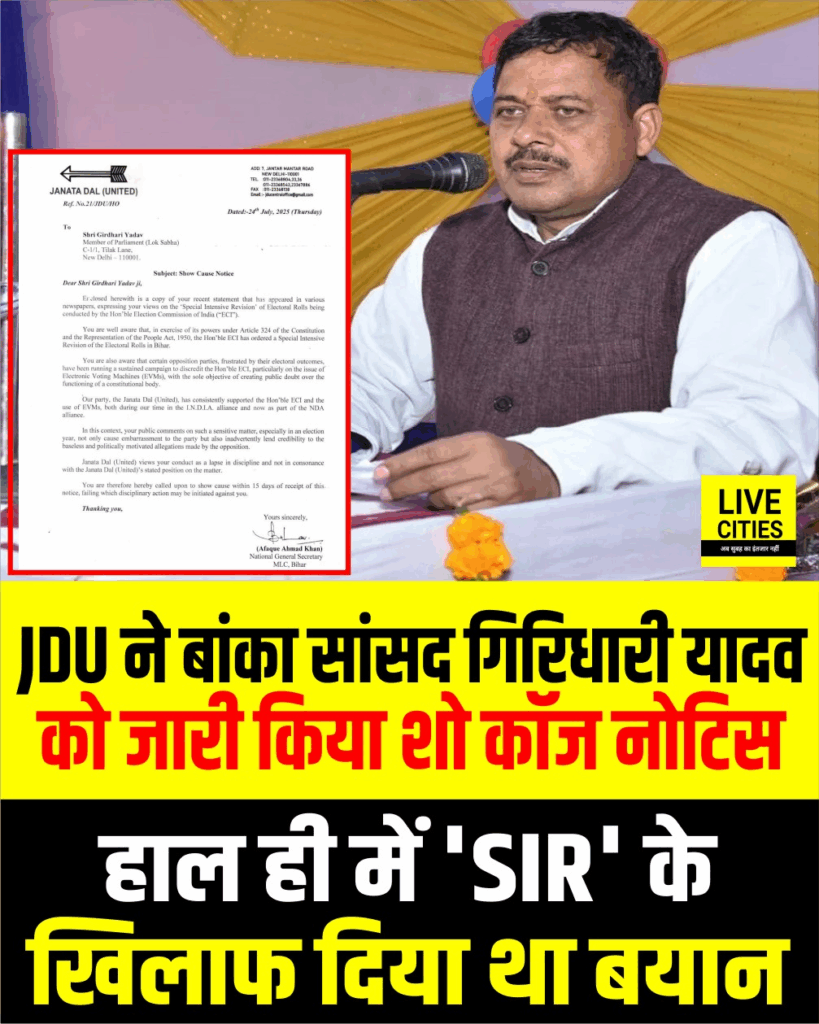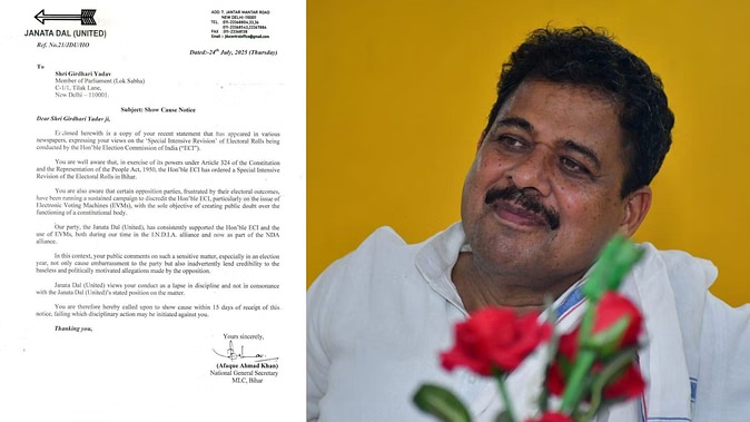 जेडीयू ने सांसद गिरधारी यादव को पार्टी लाइन से अलग बयान देने पर कारण बताओ नोटिस जारी किया है। यादव ने चुनाव आयोग की कार्यप्रणाली पर सवाल उठाए थे, जिससे पार्टी नाराज है।