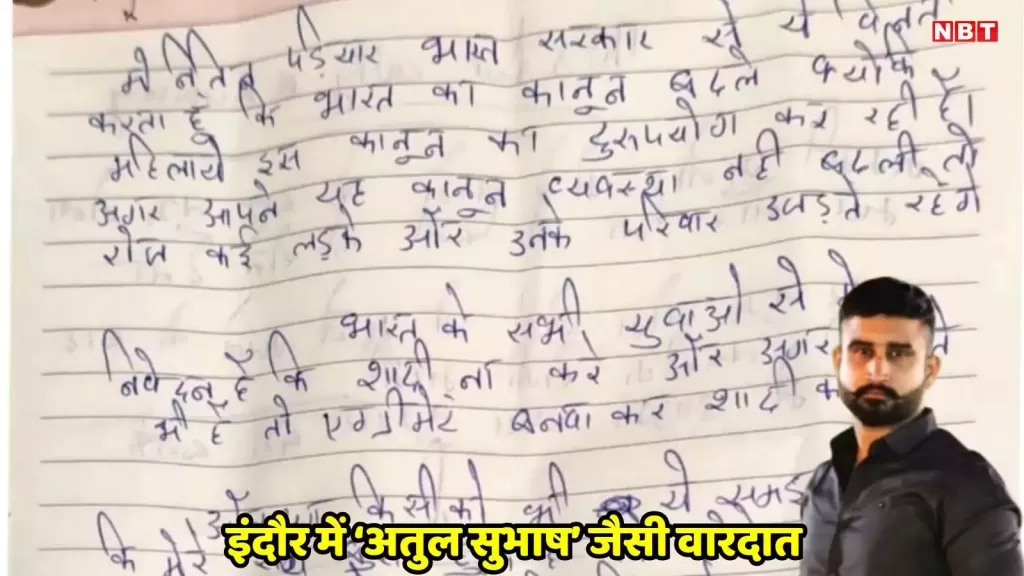 इंदौरः मध्य प्रदेश की सबसे क्लीन सिटी से अतुल सुभाष जैसी वारदात सामने आई है। शहर के बाणगंगा थाना क्षेत्र के यादव नंद नगर में एक युवक ने ससुरालवालों के टॉर्चर से परेशान होकर फांसी लगाकर आत्महत्या कर ली। मृतक की पहचान नितिन पडियार के रूप में हुई है। आत्महत्या से पहले नितिन ने एक सुसाइड नोट छोड़ा, जिसमें उसने अपनी पत्नी हर्षा शर्मा, सास सीता शर्मा, और साली मीनाक्षी शर्मा और वर्षा शर्मा को इस कदम के लिए जिम्मेदार ठहराया है। पुलिस ने शव को पीएम कराने के लिए अरविंदो हॉस्पिटल भेज दिया है। साथ ही मामले की जांच शुरू कर दी है।