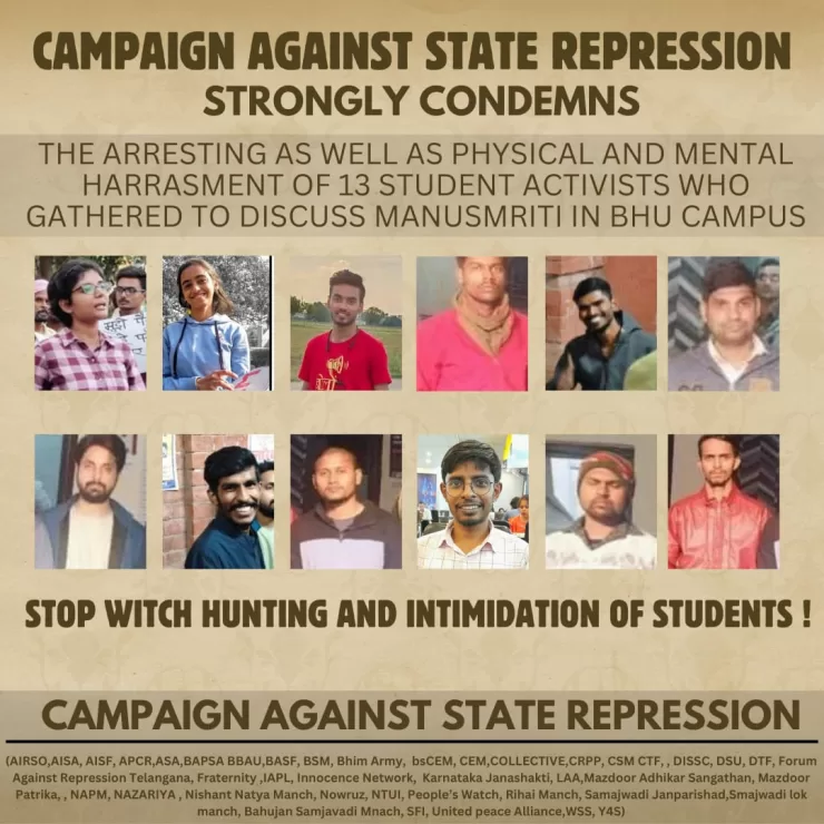 इन संगठनों की ओर से जारी प्रेस वक्तव्य में साफ कहा गया है कि छात्रों को डराना-धमकाना बंद करें !! संगठन ने राज्य दमन के खिलाफ अभियान, बीएचयू परिसर में मनुस्मृति पर चर्चा करने के लिए एकत्र हुए छात्र कार्यकर्ताओं की गिरफ्तारी के साथ-साथ शारीरिक और मानसिक उत्पीड़न की कड़ी निंदा करते हुए कहा है कि 26 दिसंबर 2024 को, बनारस हिंदू विश्वविद्यालय स्थित भगत सिंह छात्र मोर्चा (बीएसएम) के 13 सदस्यों को गैर-जमानती धाराओं के तहत एफआईआर दर्ज करने के बाद गिरफ्तार किया गया और 14 दिनों के लिए न्यायिक हिरासत में भेज दिया गया.