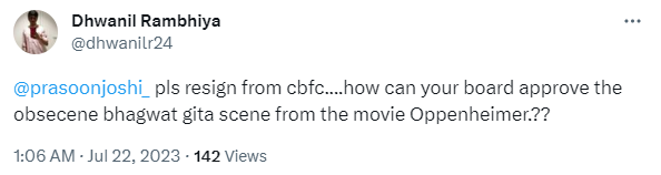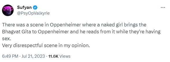 एक अन्य यूजर ने कमेंट किया, ‘ओपेनहाइमर के एक सीन में एक न्यूड लड़की गीता लेकर आती है और फिर ओपेनहाइमर उसे इंटीमेट सीन के दौरान पढ़ते हैं। मेरी नजर में यह बहुत ही अपमानजनक है।’