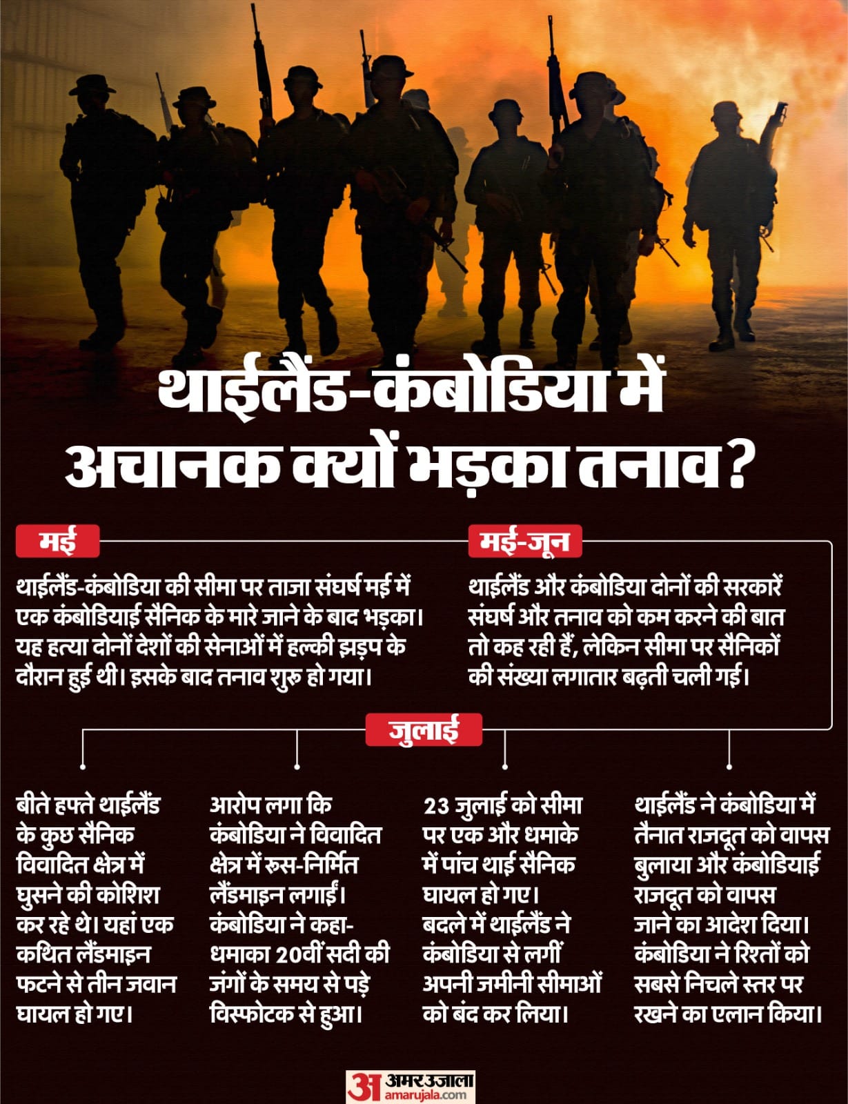 डोनाल्ड ट्रंप ने कंबोडिया और थाईलैंड की लड़ाई रुकवाने की अपनी कोशिश पर कहा, ‘मैं एक जटिल स्थिति को सरल बनाने में लगा हूं। इस युद्ध में कई लोग मारे जा रहे हैं। यह मुझे भारत और पाकिस्तान के बीच हुए संघर्ष की याद दिलाता है, जो सफलतापूर्वक रुक गया था।’ ट्रंप बार-बार ये कहते रहे हैं कि भारत और पाकिस्तान में मई में हुए संघर्ष को उन्होंने रुकवाया था। हालांकि भारत ने इसे ट्रंप के दावे को अहमियत नहीं दी है और उनके दावे को नकार दिया है।