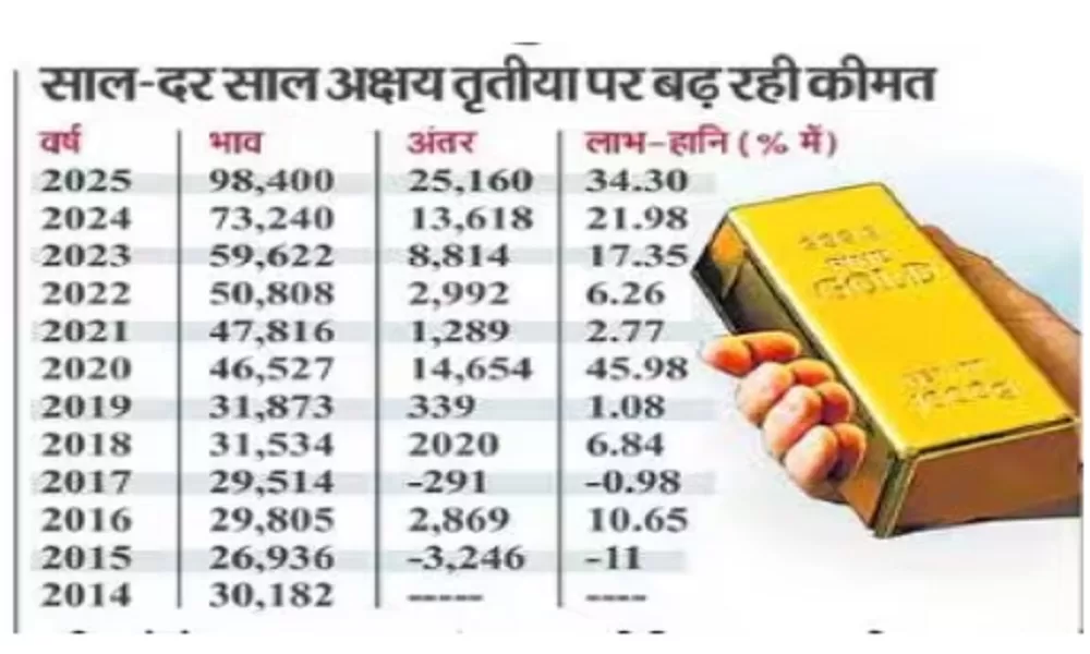 वर्ष 2014 में अक्षय तृतीया के अवसर पर 24 कैरेट सोने की कीमत लगभग ₹30,000 प्रति 10 ग्राम थी। वर्तमान में, 2025 में यह कीमत बढ़कर ₹95,900 प्रति 10 ग्राम तक पहुंच गई है। यह तीन गुना से अधिक की वृद्धि है। इन 10 वर्ष में दो बार ऐसे मौके भी आए हैं, जब सोने ने एक साल में 30 प्रतिशत प्रतिशत से अधिक का रिटर्न दिया है। कोरोना काल में इसने सबसे अधिक 47 प्रतिशत का मुनाफा निवेशकों को करवाया था।