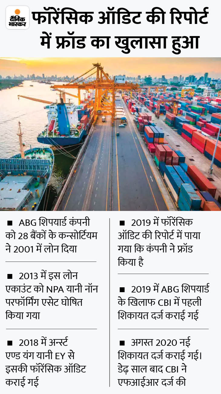 - इसके बाद बैंकों के कन्सोर्टियम की ओर से SBI ने नवंबर 2019 में ABG शिपयार्ड के खिलाफ CBI में पहली शिकायत दर्ज कराई। इस पर सीबीआई ने 12 मार्च 2020 को कुछ स्पष्टीकरण मांगा था। अगस्त 2020 नई शिकायत दर्ज कराई गई। डेढ़ साल से अधिक समय तक जांच करने के बाद CBI ने शनिवार को मामले में FIR दर्ज की।