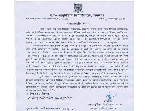 कोविड को देखते हुए प्रदेश सरकार ने एस्मा लागू किया था। जूनियर डॉक्टर भी अतावश्यक सेवाओं में आते हैं। ऐसे में वे अपने कर्त्तव्यस्थल से अनुपस्थित नहीं रह सकते हैं। सभी को नोटिस देकर चेताया गया था। इसके बावजूद वे कार्यस्थल पर नहीं लौटे। इस कारण उनके अधिष्ठाता (डीन) की अनुशंसा पर प्रदेश के 470 पीजी छात्रों का नामांकन निरस्त किया गया है।