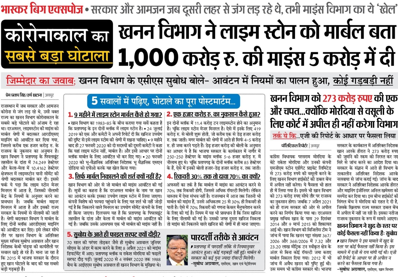 19 जुलाई को राजस्थान दैनिक भास्कर के प्रथम पृष्ठ पर एक खोजपूर्ण खबर छपी है। इस खबर में बताया गया है कि प्रतापगढ़ जिले के पीपलखूंट और केला मेला क्षेत्र की दो माइंस ब्लॉकों को मार्बल पत्थर का बता कर मात्र पांच करोड़ रुपए में राकेश मोरदिया को आवंटित कर दिया गया, जबकि इन ब्लॉकों में सीमेंट बनाने के काम आने वाला लाइम स्टोन भरा पड़ा है। यदि इन ब्लॉको को लाइम स्टोन मान कर दिया जाता तो राजस्थान सरकार को एक हजार करोड़ रुपए के राजस्व की प्राप्ति होती। कोई 85 हेक्टेयर वाले इन दोनों ब्लॉकों में लाइम स्टोन भरा है, यह बात भास्कर ने अपनी मर्जी से नहीं लिखी। 1984 से 85 के बीच हुए सर्वे और 24 जुलाई 2019 को एक कमेटी की रिपोर्ट में भी माना गया कि इन ब्लॉको में लाइम स्टोन है। लेकिन 20 फरवरी 2020 को खान विभाग के अतिरिक्त निदेशक एसएन डोडिया को एपीओ करने के बाद 28 फरवरी 2020 को तीसरी रिपोर्ट में कहलाया गया कि दोनों ब्लॉक मार्बल की श्रेणी में ही आते हैं।