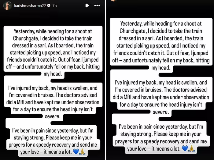 करिश्मा ने इंस्टाग्राम स्टोरी पर लिखा, ‘कल, चर्चगेट में एक शूटिंग के लिए जा रही थी। उस समय मैंने साड़ी पहनकर ट्रेन पकड़ने का फैसला किया। जैसे ही मैं ट्रेन में चढ़ी, ट्रेन की स्पीड बढ़ने लगी और मैंने देखा कि मेरे दोस्त उसे पकड़ नहीं पा रहे हैं। मैं डर के मारे मैं ट्रेन से कूद गई, और पीठ के बल गिर गई, जिससे मेरा सिर टकरा गया।’