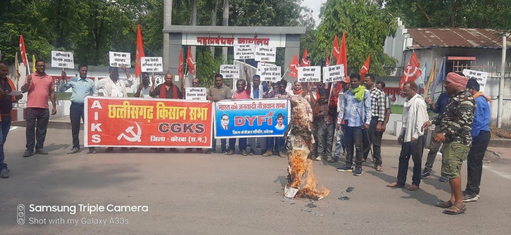 कोरबा। छत्तीसगढ़ किसान सभा और जनवादी नौजवान सभा के कार्यकर्ताओं ने आज यहां एसईसीएल के कुसमुंडा कार्यालय के सामने अग्निपथ योजना के खिलाफ उग्र नारेबाजी की तथा मोदी सरकार का पुतला फूंककर प्रदर्शन किया।