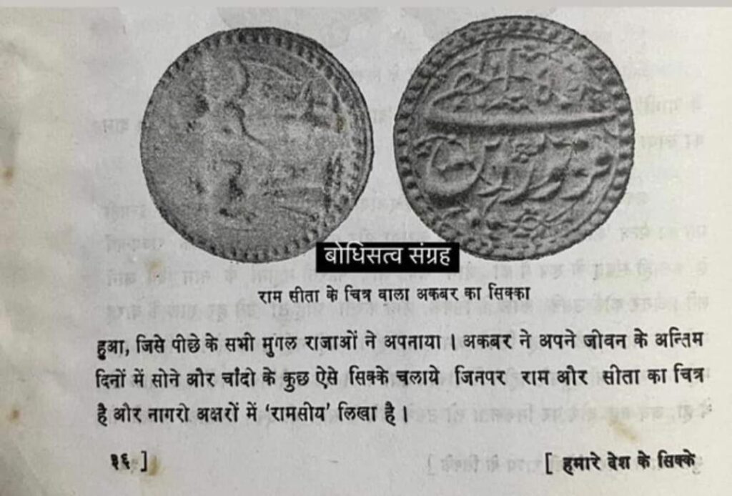 इसी बात के आकलन में मैं इस बात को अलग से कहना चाहूंगा कि अकबर ने श्रीराम प्रेम और निष्ठा में कलमा त्याग कर राम रूप को स्वीकार किया. श्रीराम अंक का वह आलेख पूरा पढ़ा जाना चाहिए. ठाकुर प्रसाद जी वर्मा ने सिक्कों की बनावट और राम सीता के परिधान पर अलग ढंग से प्रकाश डाला है. (कल्याण श्रीराम भक्ति अंक, पृष्ठ 400)