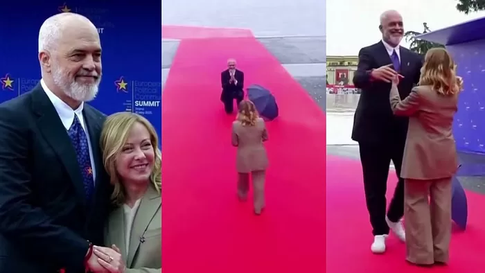 इटली की प्रधानमंत्री जियॉर्जिया मेलनी जब तिराना में यूरोपियन पॉलिटिकल कम्युनिटी समिट में पहुंचीं, तो अनोखा नजारा देखने को मिला। अल्बानिया के  पीएम एदी रामा ने रेड कार्पेट पर घुटनों के बल झुककर मेलनी का स्वागत किया। सोशल मीडिया पर इसकी खूब चर्चा रही। 3 माह पहले भी फ्यूचर्स एनर्जी समिट के लिए अबूधाबी पहुंची मेलनी का रामा ने इसी तरह स्वागत किया था। उस वक्त अल्बानियाई पीएम ने मेलनी के लिए गाना भी गाया था।