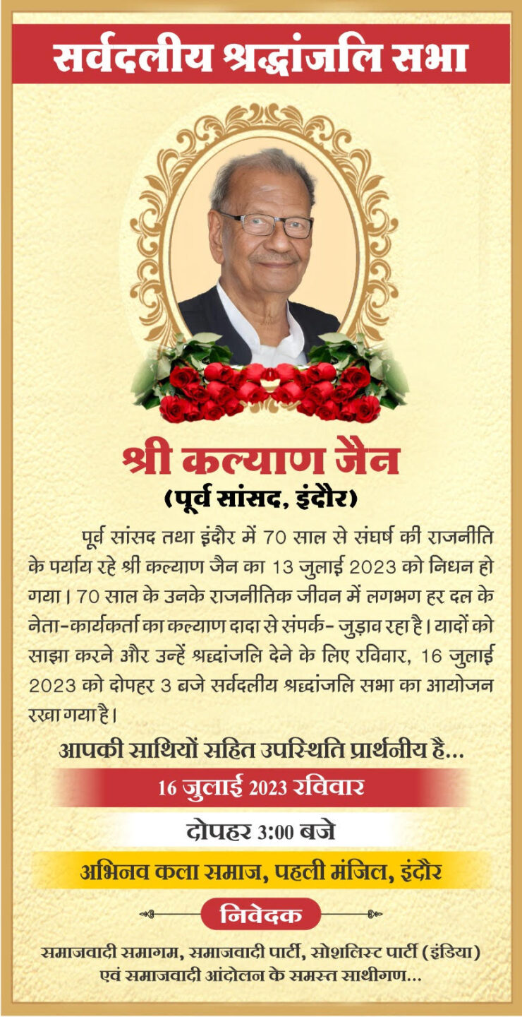 *इंदौर ।पूर्व सांसद कल्याण जैन के निधन पर आज 16 जुलाई रविवार को दोपहर 3:00 बजे सर्व दलीय श्रद्धांजलि सभा का आयोजन अभिनव कला समाज सभागृह गांधी हाल में रखा गया है ।* उक्त जानकारी देते हूए वरिष्ठ समाजवादी नेता रामबाबू अग्रवाल एवं रामस्वरूप मंत्री ने बताया कि कल्याण जैन का निधन 13 जुलाई को हो गया था ।