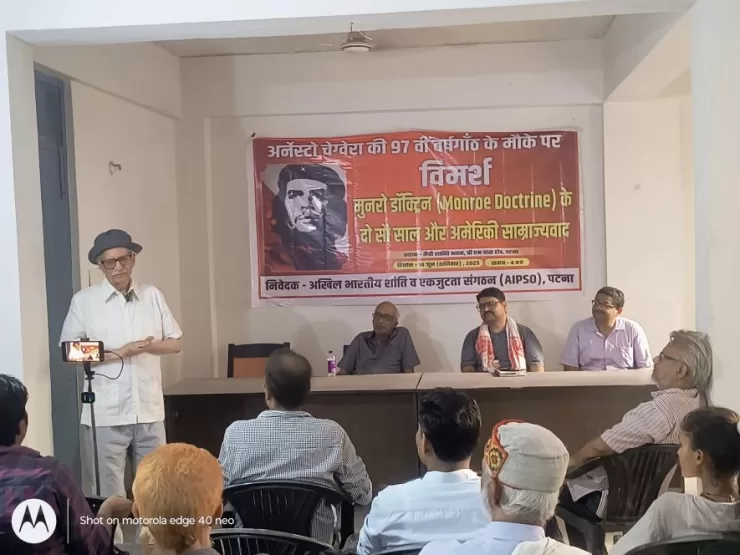 अखिल भारतीय शांति व एकजुटता संगठन (ऐप्सो) द्वारा महान लैटिन क्रांतिकारी अर्नेस्टो चे ग्वेरा की 97वीं वर्षगाँठ के अवसर पर मैत्री-शांति भवन में एक विमर्श का आयोजन किया। विमर्श का विषय था ‘ मुनरो डॉकट्रिन के दो सौ साल और अमेरिकी सम्राज़्यवाद’। इस मौके पर पटना शहर के बुद्धिजीवी, साहित्यकार, रंगकर्मी, सामाजिक कार्यकर्ता सहित विभिन्न जन संगठनों के प्रतिनिधि मौजूद थे।