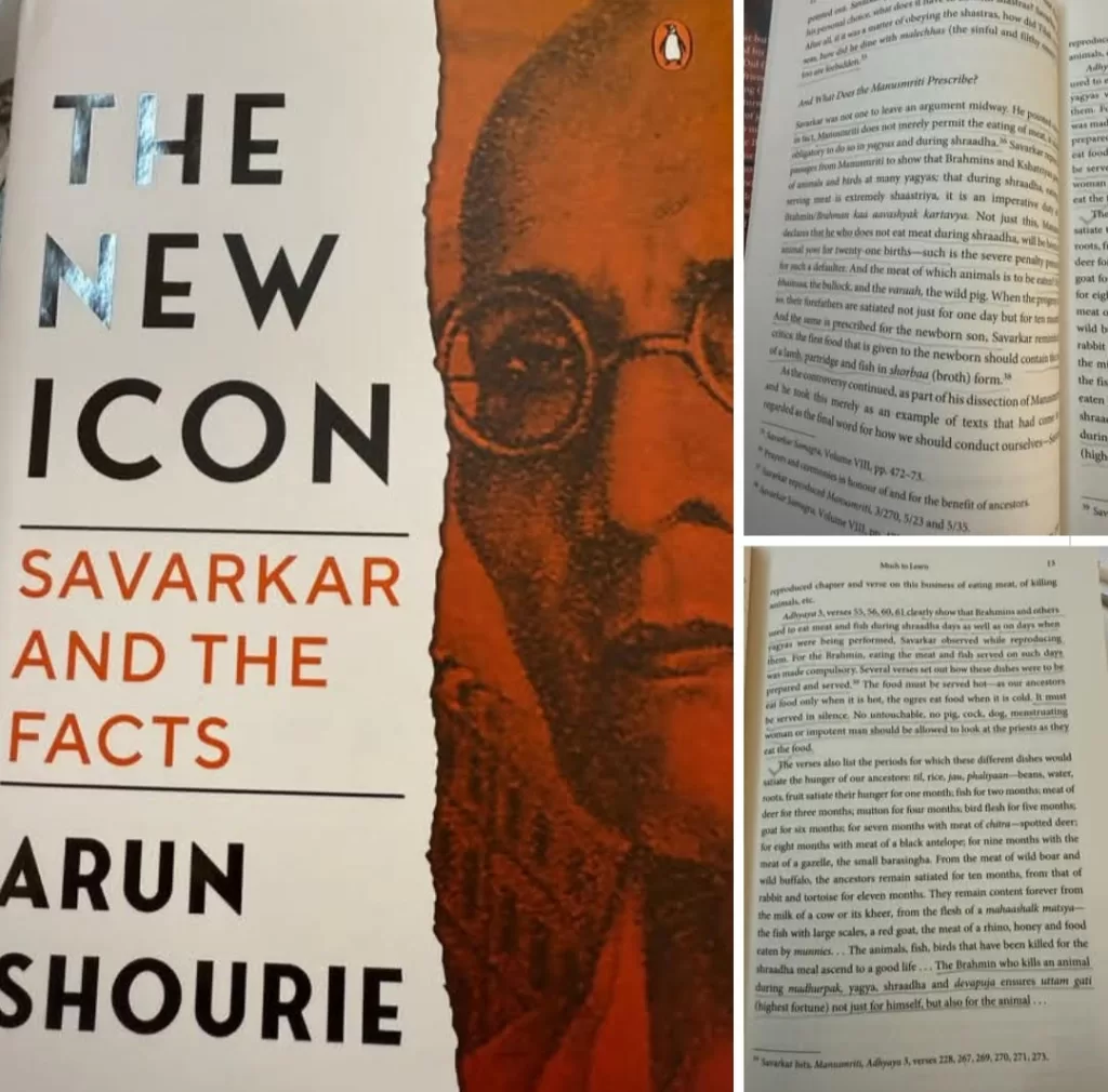 किताब के पेज नंबर 12 पर लिखा गया है कि मनुस्मृति न केवल मांस खाने की इजाजत देती है बल्कि यज्ञ और श्राद्ध में वह इसको जरूरी बताती है। इस सिलसिले में सावरकर बाकायदा मनुस्मृति के श्लोकों का हवाला देते हैं। जिसमें लिखा गया है कि ब्राह्मण और क्षत्रिय बहुत सारे यज्ञों में जानवर और चिड़ियों का भक्षण करते हैं। और यह कि श्राद्ध के दौरान मांस खाना और खिलाना बहुत ही शास्त्र सम्मत है। यह ब्राह्मणों का आवश्यक कर्तव्य है। न केवल यही बल्कि मनुस्मृति इस बात की घोषणा करती है कि श्राद्ध के दौरान जो मांस नहीं खाता है वह 21 बार जानवर की योनि में पैदा होगा। इस तरह के डिफाल्टरों के लिए इतना बड़ा दंड का प्रावधान था।