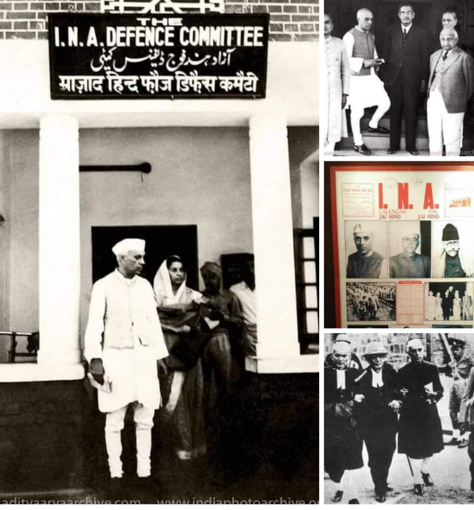 कांग्रेस द्वारा बनायी गयी समिति के अध्यक्ष तेज बहादुर सप्रू जी एवं पंडित जी इसके उपाध्यक्ष बने, अन्य सदस्य में आसफ अली, भूलाभाई देसाई, कैलाश नाथ काटजू (मार्कण्डेय काटजू के दादा जी) जैसे महान कांग्रेस नेता थे। भूलाभाई देसाई की निर्देशन में ऐतिहासिक लाल किले में मुकदमा चलाया गया। इधर लालकिले के अंदर मुकदमा चलता इधर कांग्रेस सेवादल एवं फारवर्ड ब्लाक के नौजवान आज़ादी के सिपाही लाल किले के बाहर नारा लगा रहे थे: