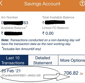 आज मैंने अपना आईसीआईसीआई बैंक का सेविंग एकाउंट चेक किया तो आज की तारीख में 706 रुपये कटा दिखा. बगल में महीने अक्षरों में लिखा था dcardfee. कस्टमर केयर पर फोन कर इसका मतलब पता किया तो बताया गया कि ये डेबिट कार्ड / एटीएम कार्ड जो मेरे पास है, उसके एवज में सालाना फीस है.