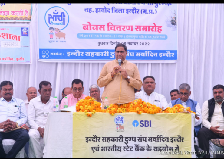 प्राप्त हुवा। कार्यक्रम को दुग्ध संघ के पूर्व अध्यक्ष श्री मौर्य द्वारा कार्यक्रम को संबोधित करते हुए, दुग्ध संघ द्वारा चलाई जा रही योजनाओं के सम्बन्ध में जानकारी देते हुए दुग्ध प्रदायको को उच्च गुणवत्ता का दूध दुग्ध समिति में प्रदाय करने का निवेदन करते हुए, दुग्ध समिति के संचालक मंडल को बोनस वितरण करने के लिए बधाई दी गई एवं उन्होंने बताया कि सहकारिता के क्षेत्र मे दुग्ध समिति एवं दुग्ध संघ ही है जो बोनस का वितरण करते है। कार्यक्रम को दुग्ध संघ के अध्यक्ष श्री मोती सिंह पटेल द्वारा संबोधित करते हुए दुग्ध संघ द्वारा संचालित योजनाओं के सम्बन्ध में जानकारी देते हुए बताया कि इंदौर दुग्ध संघ का हमेशा प्रयास रहता है की किसानो को दूध का ज्यादा से ज्यादा क्रय भाव देकर उनकी आमदनी को बढ़ाया जावे साथ ही किसानो से आग्रह किया कि स्टेट बैंक ऑफ इंडिया के माध्यम से दुग्ध उत्पादकों को पशु ऋण उपलब्ध कराया जा रहा है इसका सभी सदस्य लाभ लेते हुए दुग्ध संकलन में वृद्धि करें श्री पटेल द्वारा दुग्ध समिति के संचालक मंडल के सदस्यों एवं प्रदायको को बोनस वितरण के लिए हार्दिक बधाई प्रेषित की गई। कार्यक्रम को श्री रामस्वरूप गहलोत ने संबोधित करते हुए बोनस वितरण की बधाई देते हुए सांची के उत्कृष्ट दुग्ध उत्पादों को उपयोग में लाने की सलाह देते हुए इंदौर सहकारी दुग्ध संघ के विकास में योगदान देने का निवेदन किया। दुग्ध संघ के मुख्य कार्यपालन अधिकारी श्री द्विवेदी जी ने संबोधित करते हुए दुग्ध संघ द्वारा चलाई जा रही योजनाओं की जानकारी देते हुए उच्च गुणवत्ता का अधिक से अधिक दूध दुग्ध समिति के माध्यम से दुग्ध संघ को प्रदाय करने का निवेदन किया। कार्यक्रम में श्री मेहरबान सिंह बढ़वाया सरपंच ,श्री जीवन रामचंद्र जी, श्री नरेंद्र मकवाना , श्री इन्दर सिंह सरपंच अहीरखेड़ी,श्री इन्दर सिंह राठौर दुग्ध संघ प्रतिनिधि पालडी दुग्ध समिति, श्री डॉ अनुप सिंह चौधरी आगरा, श्री कमल चौहान ,श्री जगदीश पटेल पूर्वसरपंच श्री शेष नारायणपटेल पूर्व अध्यक्ष ,श्री लाखन पटेल ,श्री ए एल पोरवाल, श्री पी एस भाटिया प्रबंधक,समिति पर्यवेक्षक श्री शिवनारायण बढ़वाया ,श्री रोहित नागर , श्री दीपक बारोड ,श्री राजेश पटेल एवं दुग्ध समितियों के अध्यक्ष, सचिव, दुग्ध समिति के समस्त सदस्य उपस्थित हुए। कार्यक्रम का संचालन श्री ओम प्रकाश सोनी जी प्रबन्धक क्षेत्र संचालन द्वारा किया गया।