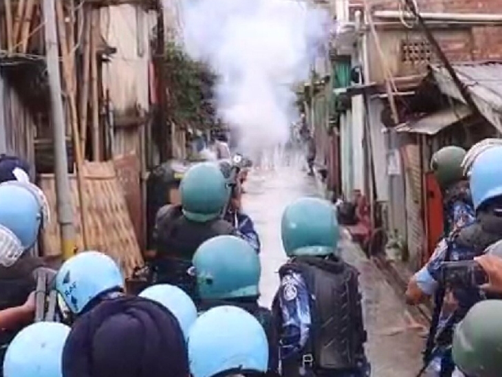 इंफाल की एक गली में प्रदर्शनकारियों पर आंसू गैस के गोले दागते RAF के जवान।