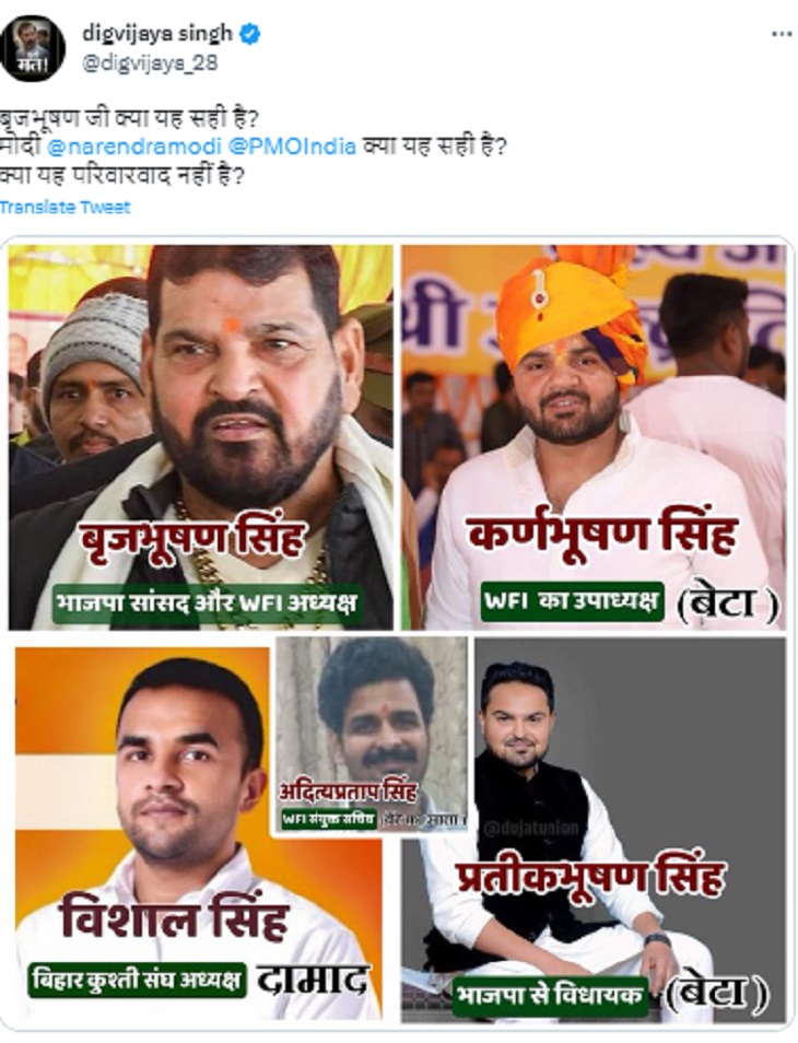 भारतीय कुश्ती संघ (WFI) के अध्यक्ष बृजभूषण की गिरफ्तारी की मांग को लेकर पहलवानों के धरने का आज रविवार को 10वां दिन है। कांग्रेस के राज्यसभा सांसद दिग्विजय सिंह ने एक ट्वीट कर बृजभूषण, उसके 2 बेटे, दामाद और बेटे के साले के कुश्ती संघ में विभिन्न पदों पर होने पर सवाल खड़े किए हैं। दिग्विजय ने पीएम मोदी से सवाल किया कि क्या यह परिवारवाद नहीं है?