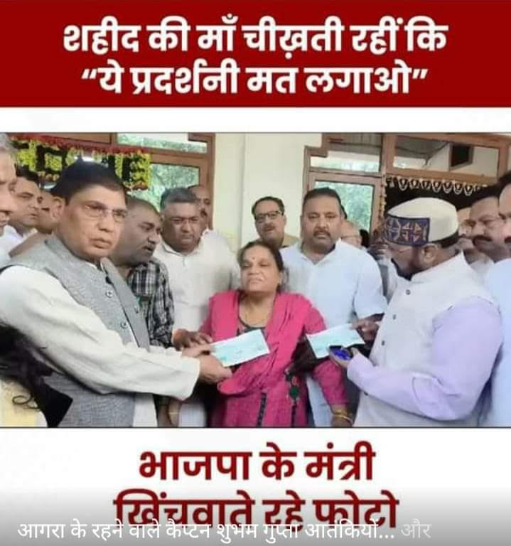 तो ऐसे साहिब जी का असर नेताओं में भी इस कदर परवान चढ़ा कि आतंकियों से मुठभेड़ में आगरा के शहीद कैप्टन शुभम गुप्ता के घर भाजपा सरकार के मंत्री योगेंद्र उपाध्याय जब शहीद की मां को चेक देने गए तो शुभम की मां की इच्छा का अनादर करते हुए बेशर्मी से मंत्री जी ने चेक देने की फोटो खिंचवाई।मां ने अपने हाथों में चेक नहीं लिया तो मंत्री जी। चेक लेकर रोती बिलखती चीखती रही -‘ये प्रदर्शनी मत लगाओ भाई ‘कहने के बावजूद पर फोटो जीवी मंत्री नहीं माने ये कैसी संवेदनहीनता है कि शहीद की मां के आंसुओं की ज़रा भी परवाह नहीं की गई।जो राशि मदद हेतु देनी थी वह सीधे खाते में भी डाली जा सकती थी या किसी और जिम्मेदार व्यक्ति को उनकी इच्छा का पालन करते हुए चेक दिया जा सकता था।अब शायद मंत्री जी को अति प्रसन्नता हो रही होगी जब विभिन्न चैनलों पर शहीद की मां के रोते बिलखते चित्र देखें होंगे।