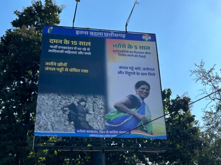 ये दोनों होर्डिंग कांग्रेस पार्टी द्वारा लगाए गए थे। पहले में यह बताने का प्रयास था कि कांग्रेस के राज में छत्तीसगढ़ में खुशहाली और शांति थी, जबकि उसके पहले भारतीय जनता पार्टी (भाजपा) के शासनकाल में प्रदेश को अंधकार में धकेल दिया गया था और फर्जी मुठभेड़ की घटनाएं आम बात थीं।