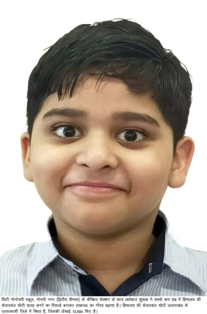 लखनऊ। सिटी मोन्टेसरी स्कूल, गोमती नगर (द्वितीय कैम्पस) के कैम्ब्रिज सेक्शन के कक्षा-5 के छात्र अधोक्षज शुक्ला ने सबसे कम उम्र में हिमालय की केदारकंठ चोटी फतह करने का रिकार्ड बनाकर लखनऊ का गौरव बढ़ाया है। हिमालय की केदारकंठ चोटी उत्तराखंड के उत्तरकाशी जिले में स्थित है, जिसकी ऊँचाई 12,500 फिट है। सी.एम.एस. संस्थापक डा. जगदीश गाँधी ने सी.एम.एस. के इस प्रतिभाशाली छात्र के साहस व दृढ़संकल्प की प्रशंसा करते हुए उसके उज्जवल भविष्य की कामना की है। सी.एम.एस. के मुख्य जन-सम्पर्क अधिकारी श्री हरि ओम शर्मा ने बताया कि केदारकांठ की चोटी पर चढ़ना आसान नहीं है क्योंकि पूरा रास्ता बेहद खड़ी चढ़ाई का है और पर्वत शिखर के करीब चढ़ाई अत्यन्त मुश्किल है। ऐसे में, सी.एम.एस. के इस प्रतिभाशाली छात्र ने अपने साहस, शारीरिक क्षमता तथा आत्मविश्वास का अभूतपूर्व प्रदर्शन कर यह उपलब्धि अपने नाम की। श्री शर्मा ने बताया कि पर्यावरण के प्रति सी.एम.एस. के इस छात्र की जागरूकता और पहाड़ों को कूड़े व प्रदूषण से बचाने के उसके जुनून व दृढ़ संकल्प को देखते हुए उसे पर्वतारोहण के इस अभियान में ग्रुप इन्वायर्नमेन्ट लीडर बनाया गया था। पर्वतारोहण का यह अभियान हॉस्टल एसोसिएशन के अन्तर्राष्ट्रीय संघ ‘वाई.एच.ए.आई.’ के तत्वावधान में आयोजित किया गया।