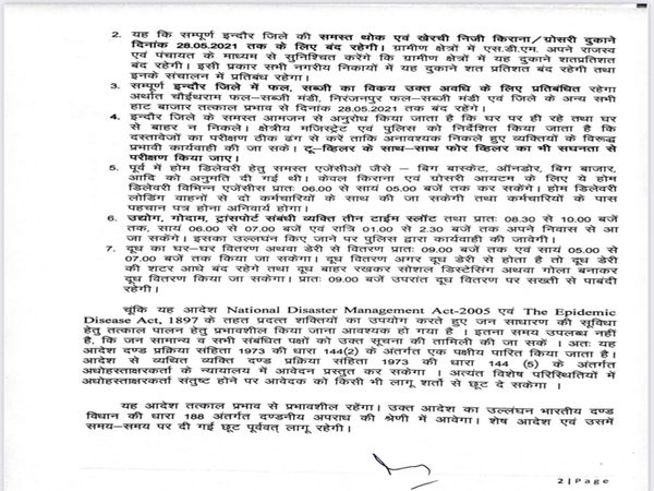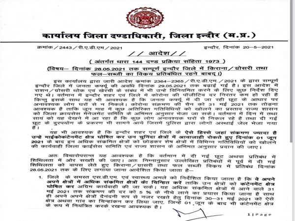 जिला प्रशासन ने पुराने आदेश में संशोधन करते हुए गुरुवार रात नया आदेश जारी किया। इसमें 21 मई से लेकर 28 मई तक सभी किराना और ग्रॉसरी की दुकानें बंद रहेंगी। इसके साथ-साथ फल और सब्जी भी नहीं बेची जाएंगी। चोइथराम मंडी से भी फल और सब्जी का विक्रय नहीं होगा। कलेक्टर मनीष सिंह ने कहा- इंदौर में कोरोना की संक्रमण पर काबू में आ रही है। इसे 30 तारीख तक काबू में करने के लिए कुछ करें निर्णय लेना पड़ रहे हैं। हालांकि ऑनलाइन राशन सप्लाई करने वाली चेन चालू रहेगी।