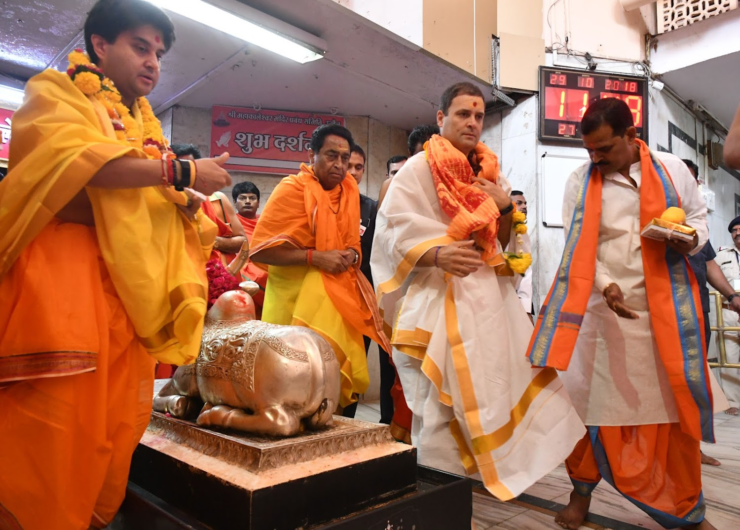 कांग्रेस नेता राहुल गांधी, कमलनाथ और ज्योतिरादित्य सिंधिया, जो अब बीजेपी में हैं, 29 अक्टूबर 2018 को उज्जैन के एक मंदिर में पूजा करते हुए।