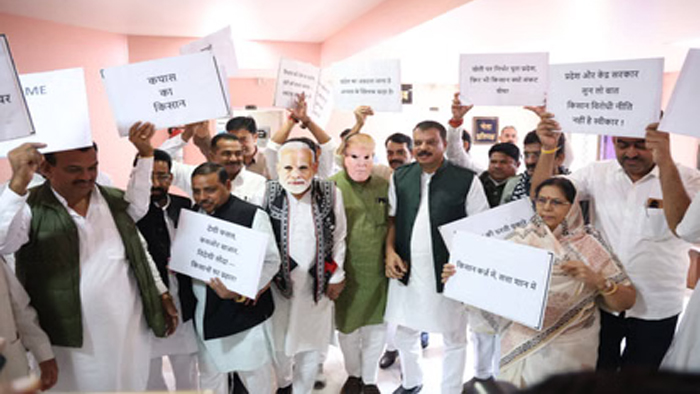 नेता प्रतिपक्ष उमंग सिंघार के नेतृत्व में कांग्रेस विधायक विधानसभा परिसर में महात्मा गांधी की प्रतिमा के सामने एकत्र हुए। इस दौरान उन्होंने प्रधानमंत्री नरेंद्र मोदी और अमेरिका के राष्ट्रपति डोनाल्ड ट्रंप के मुखौटे पहनकर नारेबाजी की और ट्रेड डील का विरोध जताया।