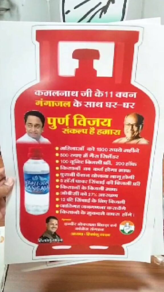 गुरुवार को भोपाल स्थित प्रदेश कांग्रेस कार्यालय में गंगाजल की बोतल और 11 वचन के पोस्टर जारी किए गए। इन बोतलों को इंदौर जिले की हर विधानसभा क्षेत्र में बांटा जाएगा।