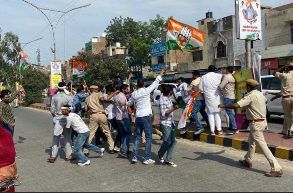 श्रीगंगानगर में केजरीवाल का काफिला रामलीला मैदान की तरफ बढ़ रहा था। उसी दौरान यूथ कांग्रेस कार्यकर्ताओं ने काले झंडे दिखाने शुरू कर दिए। अचानक यूथ कांग्रेस कार्यकर्ता केजरीवाल की गाड़ी के पास तक आ गए। इससे वहां अफरा-तफरी का माहौल हो गया।