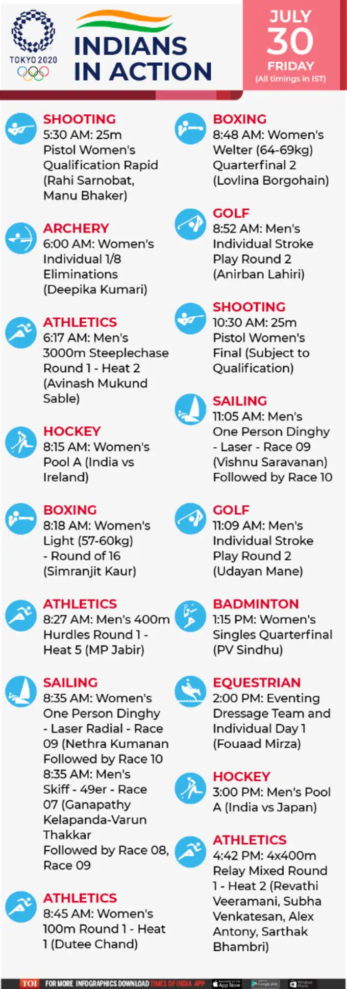- भारत के लिए अहम है आज का दिननमस्कार, तोक्यो ओलिंपिक अब लगभग अपने आधे पड़ाव पर पहुंच चुका है। आज 30 जुलाई का दिन भारत के लिए लिहाज से काफी अहम है। कई भारतीय खिलाड़ी आज अपना मेडल पक्का कर सकते हैं। भारत को निशानेबाजी, तीरंदाजी, बॉक्सिंग, बैडमिंटन और हॉकी में अहम मुकाबले खेलने हैं।