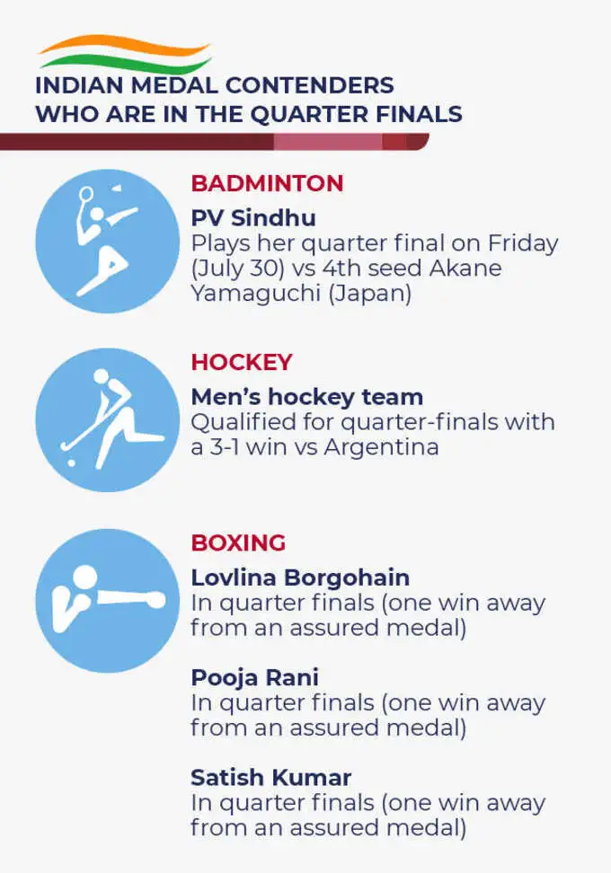 - दीपिका, मनु-राही और लवलीना से आसआर्चरी में दीपिका कुमारी, शूटिंग में मनु भाकर और राही सरनोबत भारत को मेडल दिला सकती हैं। बॉक्सिंग में लवलिना बोरगोहेन अगर आज अपना क्वॉर्टर फाइनल मैच जीत लेती हैं तो वह सेमीफाइनल में पहुंच जाएंगी और इस तरह वह भारत के लिए कम से कम ब्रॉन्ज मेडल सुनिश्चित कर देंगी।