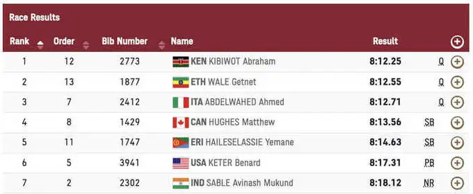 - ऐथलेटिक्स: पुरुषों की 3000 मीटर स्टीपलचेस राउंड1- हीट2, अविनाश का नैशनल रेकॉर्डअविनाश सैबल ने पुरुषों की 3000 मीटर स्टीपलचेस रेस में 8:18.12 का समय निकालकर नैशनल रेकॉर्ड बनाया। लेकिन यह टॉप 3 में पहुंचने के लिए काफी नहीं है। यानी उन्हें फाइनल में सीधा एंट्री नहीं मिलेगी।