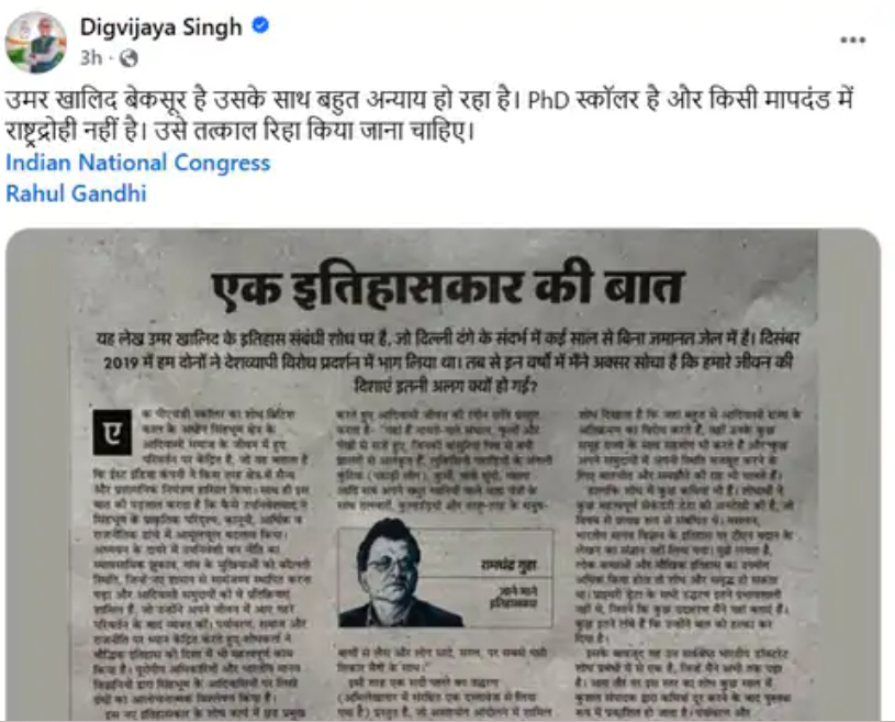 दिग्विजय ने अपने पोस्ट में स्पष्ट किया कि उमर खालिद पर लंबे समय से न्यायिक प्रक्रिया में देरी हो रही है और उनकी नियमित जमानत नहीं दी गई। उन्होंने कहा कि खालिद के खिलाफ लंबित मुकदमों के बावजूद उन्हें बेकसूर मानना चाहिए।