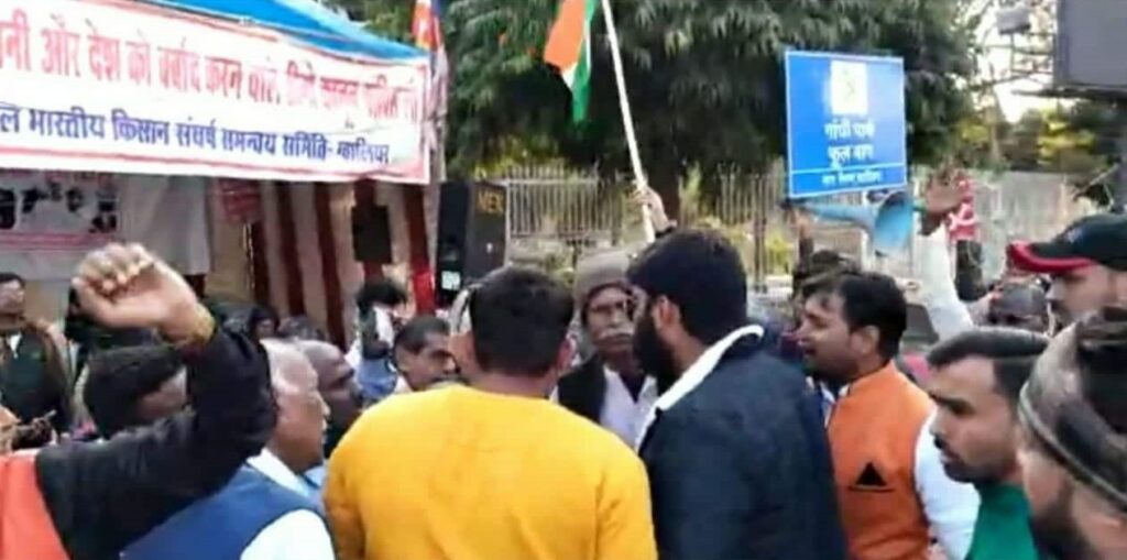 अपने ऊपर अचानक हुए हमले का धरने पर बैठे लोगों ने भी जवाब दिया। तो कुछ भाग खड़े हुए। पुलिस की मौजदूगी में उन लोगों ने आधे घंटे से ज्यादा समय तक बीच चौराहे पर उत्पात मचाया। किसानों का आरोप है कि सरकार के इशारे पर भाजपा और आरएसएस के लोगों ने यहाँ उपद्रव किया है, लोगों को जातिगत गालियाँ दी हैं, महिलाओं से अभद्रता की है। इन पर तत्काल कार्रवाई की जानी चाहिए और इन्हें गिरफ्तार किया जाना चाहिए। उधर मौके पर पहुंचे एडिशनल एसपी सतेंद्र सिंह तोमर ने कहा है कि उपद्रवियों की पहचान की जायेगी और पूरे मामले की जांच कर कार्रवाई की जायेगी।