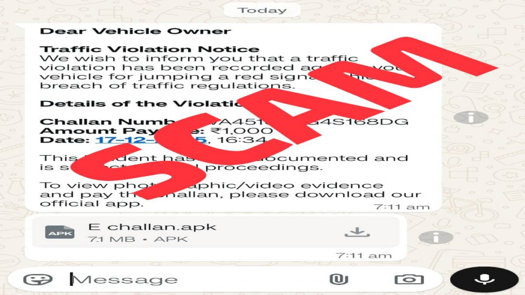 बताया जाता है कि रेड सिग्नल क्रॉस करने के नाम पर साइबर ठग apk (Android Package Kit) फाइल भेज रहे हैं। सिग्नल जंप करने पर ट्रैफिक विभाग जैसा ई-चालान की पीडीएफ फाइल और एक मैसेज भेजता है, ठीक वैसा ही मैसेज और पीडीएफ फाइल साइबर ठग भी मिनी मुंबई में लोगों को भेज रहे हैं। मिनी मुंबई से हर रोज सैकड़ों शिकायत आ रहे है।