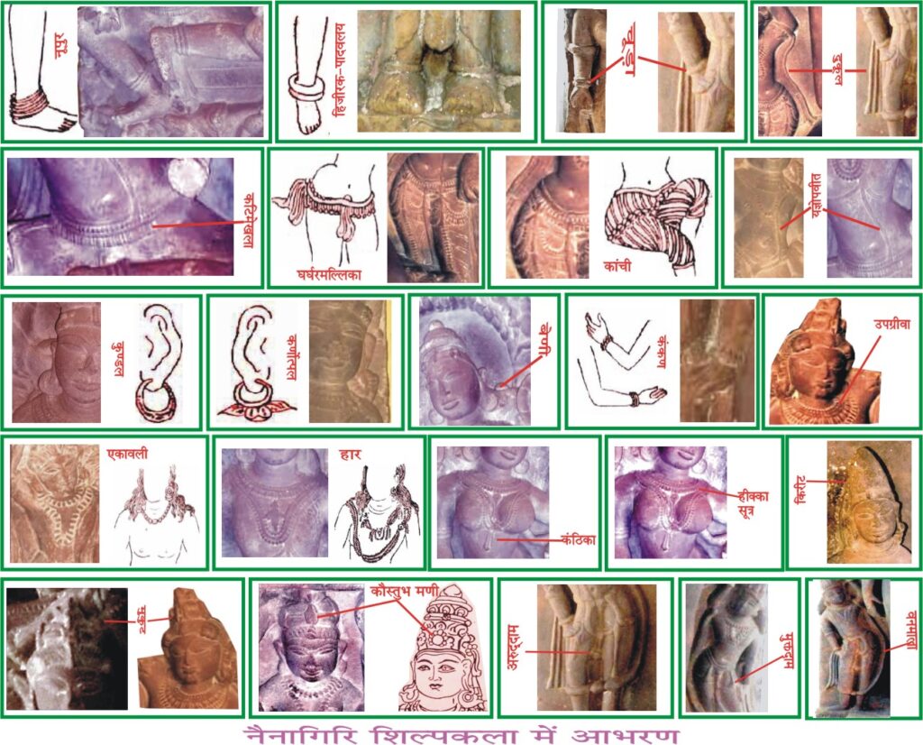 नैनागिरि शिल्पकला में देवी-देवताओं व परिकर के पात्रों को बहुत सूक्ष्मता और उत्कृष्टता से आभरणों से अलंकृत किया गया है। देवों ही नहीं गजों को भी विविध अलंकरणों से भूषित किया है। नैनागिरि की मूर्तियों से ही लेकर यहाँ कुछ आभरणों का विवरण इस प्रकारा है-