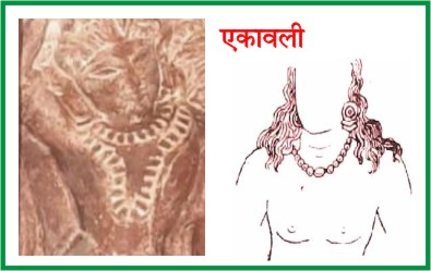 एकावली- एकावली मोती युक्त माला है। यह एक लड़ की होने से एकावली कहलाती है। देवों में भी निम्रजाति के पात्रों को यह धारण करवाई जाती है। नैनागिरि शिल्पकला में इसे देखा जा सकता है।