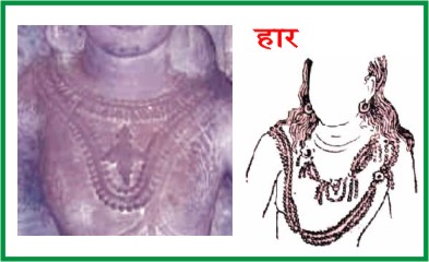 हार – हार गले में धारण किया जाने वाला वह आभरण है जिसमें एक से अधिक लडिय़ाँ होतीं हैं। इसे कई तरह से सुसज्जित किया जाता है। परिकर के यक्ष-यक्षी, भक्त, चॅवरधारी आदि को यह विभूषित किया गया है।