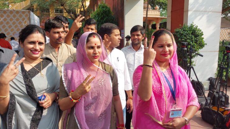 मतदान कर बाहर निकलीं महिला पार्षदों ने विक्ट्री साइन बनाया। ग्रेटर नगर निगम में चुनाव के लिए दोनों पार्टी के बड़े नेता लगातार सक्रिय रहे।