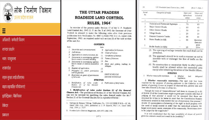 उत्तर प्रदेश रोड साइड कंट्रोल एक्ट 1964 में यह साफ अंकित है कि सड़क के मध्य रेखा से राष्ट्रीय राजमार्ग अथवा राज्य राजमार्ग में 75 फुट तथा मेजर डिस्ट्रिक्ट रोड में 60 फुट एवं आर्डिनरी डिस्ट्रिक्ट रोड में 50 फुट अंतराल छोड़ना आवश्यक है। यह दूरी छोड़ने के पश्चात ही कोई खुला निर्माण या बाउंड्री आदि निर्माण कार्य कर सकते हैं। इस नियम में एक अहम बात और है कि सभी प्रमुख मार्गों की मध्य रेखा से 100 फुट की दूरी तक कोई छत युक्त निर्माण कार्य नहीं किया जा सकता।