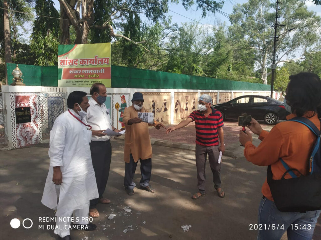 इंदौर। संयुक्त किसान मोर्चा की इंदौर इकाई द्वारा संपूर्ण क्रांति दिवस की पूर्व संध्या पर आज सांसद शंकर लालवानी के कार्यालय के समक्ष प्रदर्शन कर तीनों कृषि कानूनों की होली जलाई गई । गौरतलब है कि संयुक्त किसान मोर्चा और अखिल भारतीय किसान संघर्ष समन्वय समिति ने संपूर्ण क्रांति दिवस के मौके पर तीनों किसान विरोधी कानूनों की सांसद , विधायक के कार्यालय के समक्ष होली जलाने का आव्हान किया था । इसी के तहत इंदौर के सांसद शंकर लालवानी के पलासिया स्थित कार्यालय के समक्ष इंदौर के किसान संगठनों ने संयुक्त रूप से किसान विरोधी कानूनों की होली जलाई ।कार्यकर्ताओं ने बड़ी देर तक नारेबाजी की । आज के इस प्रदर्शन में अखिल भारतीय किसान सभा, किसान खेत मजदूर संगठन और किसान संघर्ष समिति के कार्यकर्ता शरीक थे। कार्यकर्ताओं ने तीनों क्रृषि कानूनों को जनविरोधी बताते हुए इन्हे तत्काल वापस किए जाने की मांग की । प्रदर्शन का नेतृत्व सर्वश्री रामस्वरूप मंत्री, अरुण चौहान, हरिओम सूर्यवंशी ,प्रमोद निदेश, सोनू शर्मा आदि ने किया। प्रदर्शनकारी तीनों किसान विरोधी कानूनों को रद्द कराने, बिजली संशोधन बिल वापस लेने एवं सभी कृषि उत्पादों की लागत से डेढ़ गुना दाम पर खरीद की कानूनी गारंटी की मांग कर रहे थे।
