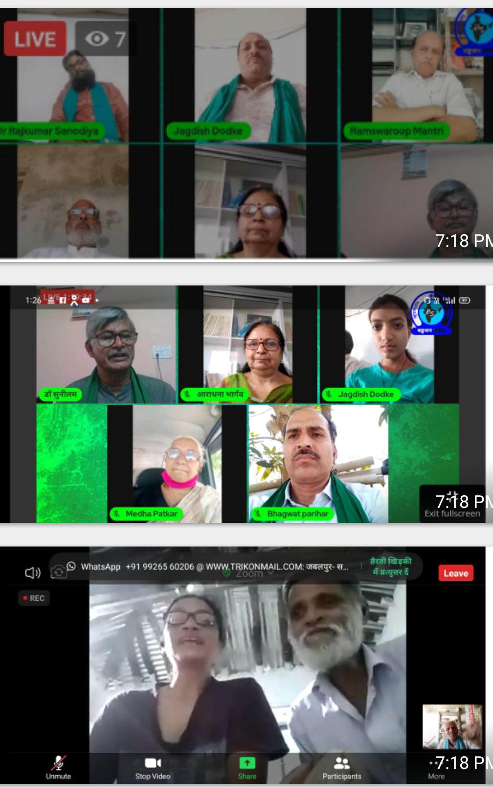आज 10 से 12 बजे किसान पंचायत जूम पर तथा 12 से डेढ़ बजे के बीच बहुजन सम्वाद पर आयोजित की गई जिसमें प्रदेश के 20 जिलों के 40 साथियों ने अपने विचार रखें। ऑनलाइन किसान पंचायत को संबोधित करते हुए नर्मदा बचाओ आंदोलन की नेत्री मेधा पाटकर ने कहा कि न्याय व्यवस्था को किसान आंदोलन के प्रति जो संवेदना दिखाना चाहिए वह नहीं दिखा रही है। सरकार ने जो एमएसपी तय की है वह भी सही नही है । स्वामीनाथन की रिपोर्ट के अनुसार यदि गेहूं के दाम का आंकलन किया जाए तो गेहूं का तीन हजार से भी अधिक दाम मिलेगा। एमएसपी बढ़ेगी तो मजदूरों की मजदूरी भी बढ़ेगी। उन्होंने कहा कि आज गैर बराबरी मिटाने का वक्त है। किसानों को मजदूरों के सम्मान कार्यक्रम आयोजित करना चाहिए।