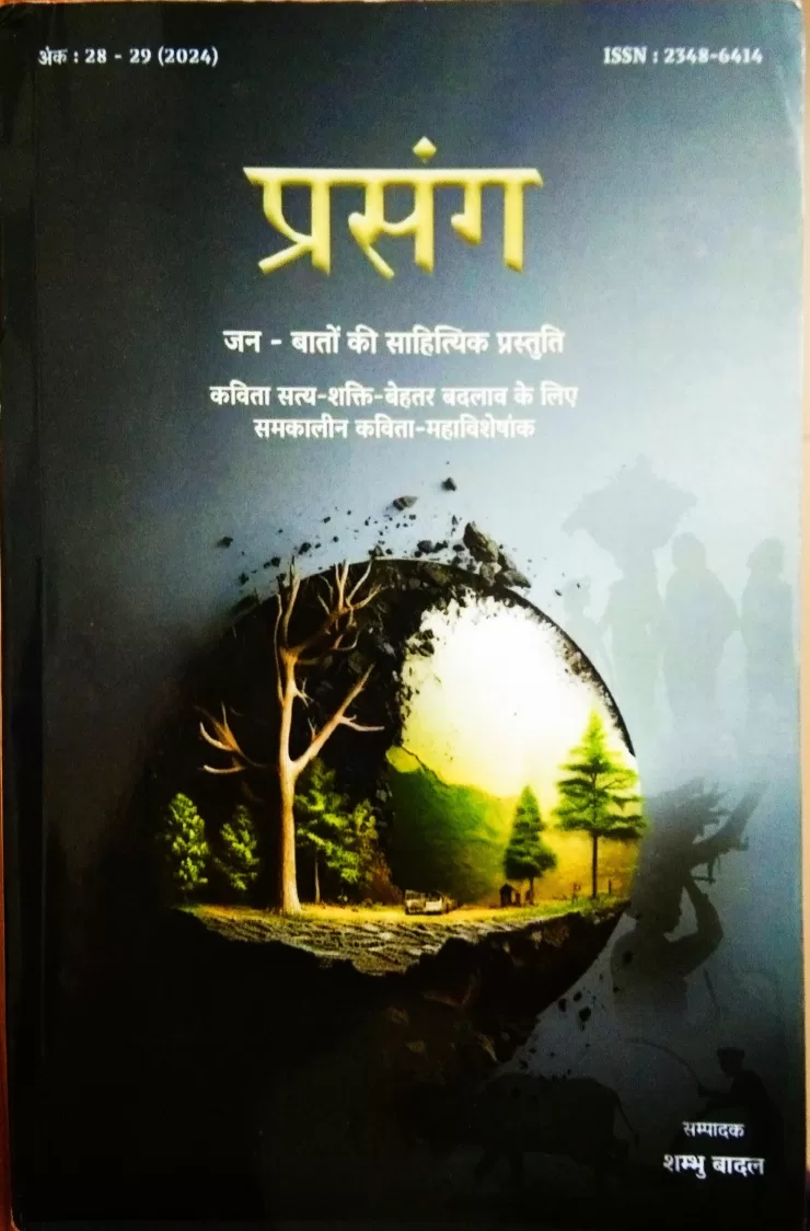 ‘प्रसंग’ का कविता महाविशेषांक बहुत दिनों से आया है लेकिन इसे ठीक से पलट नहीं भी नहीं सका इसलिए कुछ कहने से रुका रहा। दो एक दिनों में कुछ रचनाएं पढ़ी हैं। गद्य खंड पहले पलटा उसमें भी आलेख सबसे पहले देखे। चूँकि अंक बड़ा है इसलिए समय लगा। इसकी तैयारी में आदरणीय शंभु बादल जी ने डेढ़- दो वर्ष का यथेष्ट समय और श्रम लगाया जिसका प्रतिफल है यह विशद अंक। शंभु बादल जी से संभवतः मेरी कभी प्रत्यक्ष भेंट नहीं हुई लेकिन ‘धरती’ और ‘प्रसंग’ के परस्पर विनिमय के कारण सन 1981 से लेखकीय परिचय रहा है। प्रसंग का दूसरा अंक भी कवितांक था। उन्हाेंने तब भी मेरी कविता बुलाई थी और इस बार भी कोई डेढ़ वर्ष पहले कविताएं भेजने के लिए उनका फोन आया था। बीच में भी प्रसंग में मैं शामिल रहा हूँ। उनकी आत्मीयता सदैव रही है। खैर, बात इस अंक की कि क्यों यह विशेषांक और उसमें क्या विशेष है। तो अपने संपादकीय में यह स्पष्ट किया है कि इक्कीसवीं सदी में विशेषकर तीसरे दशक में उपभोक्तावाद, आर्थिक असमानता, लूट, शोषण, भ्रष्ट आचरण से सामान्य मनुष्यों के जीवन में कठिनाइयां और जटिलताएं बढ़ी हैं। महाविपत्ति कोरोना ने इसमें जले में नमक का काम किया। पूंजीवादी दुष्टता, संवेदनहीनता यहाँ चरम पर दिखी। सूचना प्रौद्योगिकी का कमाल और धमाल दोनों दिख रहा है। ऐसी स्थितियों में कविता शायद मरहम का काम कर सके| उनके विचार से कविता संवेदना का रूप है। संवेदनशीलता से कविता जन्मशती है। अतः कविता का मूल भाव संवेदना ही है। अब बात रचनाओं की। संक्षेप में ही कहूंगा। सभी रचनाओं पर बात करना बहुत मुश्किल है लेकिन प्रथमदृष्टया एक पाठकीय टिप्पणी आवश्यक लगी।