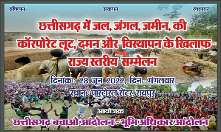 रायपुर। छत्तीसगढ़ में जल, जंगल, जमीन, खनिज और अन्य प्राकृतिक संसाधनों की कॉरपोरेट लूट तथा इसके खिलाफ लड़ रहे संगठनों और कार्यकर्ताओं पर दमन के खिलाफ भूमि अधिकार आंदोलन का राज्य स्तरीय सम्मेलन 28 जून को पेस्टोरल सेंटर, बैरन बाजार, रायपुर में आयोजित किया जा रहा है। छत्तीसगढ़ बचाओ आंदोलन द्वारा आयोजित इस सम्मेलन में छत्तीसगढ़ में भूमि से विस्थापन, पुनर्वास, पर्यावरण संरक्षण, आदिवासियों, दलितों व कमजोर तबकों के अधिकार और आजीविका जैसे मुद्दों पर काम कर रहे अनेक संगठनों और उनके प्रतिनिधियों के भाग लेने की संभावना है। इन आंदोलनों से जुड़े हन्नान मोल्ला, मेधा पाटकर, सुनीलम, बादल सरोज, प्रफुल्ल समंत्रा जैसे राष्ट्रीय नेता भी इस सम्मेलन में शिरकत करेंगे।
