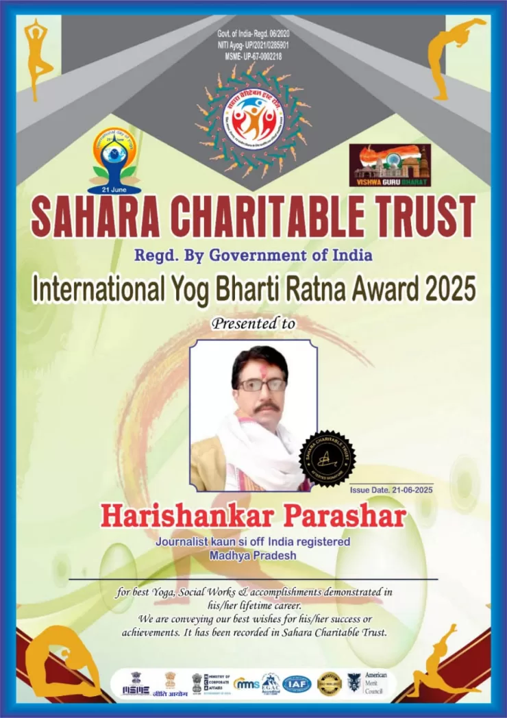 भोपाल, 21 जून 2025: मध्य प्रदेश के प्रसिद्ध पत्रकार और सामाजिक कार्यकर्ता हरिशंकर पाराशर को उनके योग और सामाजिक कार्यों के उत्कृष्ट योगदान के लिए “अंतरराष्ट्रीय योग भूषण रत्न पुरस्कार 2025” से सम्मानित किया गया है।