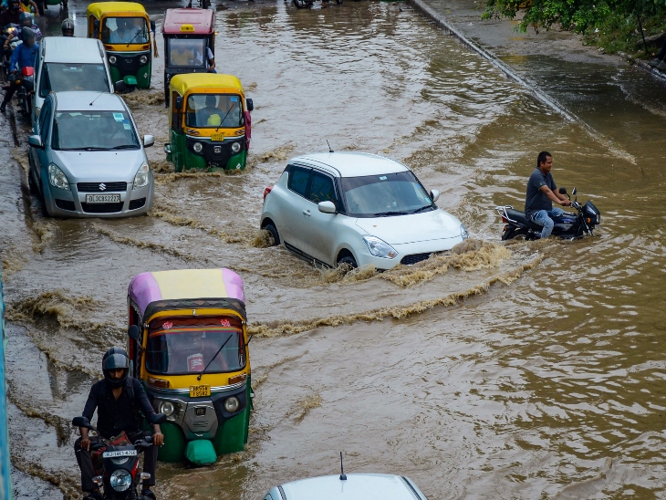 गुरुग्राम में बारिश के कारण सड़कों पर पानी भर गया।