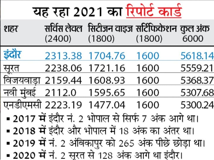 स्वच्छ सर्वेक्षण 2021 और 20 दोनों 6000 अंकों के थे। 2020 में इंदौर को 5647.56 अंक मिले थे। 2021 में 5618.14 मिले हैं। पिछले साल से 29.42 अंक कम आए हैं। नंबर 2 सूरत ने 39.62 अंक की बढ़त ली है।