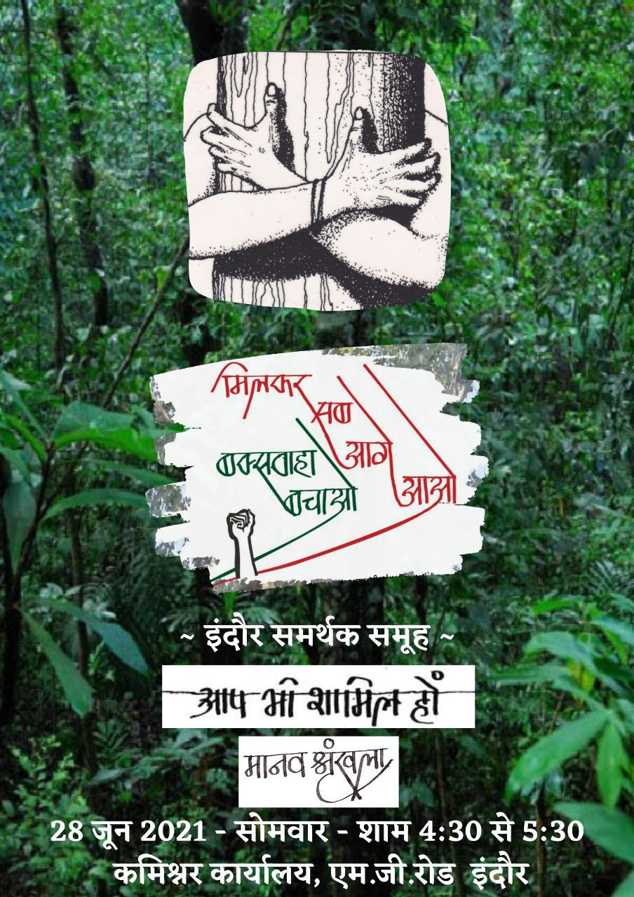 इंदौर।  मध्य प्रदेश की पर्यावरण विरोधी और पूंजीपतियों की रक्षक सरकार द्वारा प्रदेश के पर्यावरण और जंगल को नष्ट करने के फैसले के खिलाफ पूरे मध्यप्रदेश में आक्रोश है । मध्यप्रदेश में सक्रिय जन संगठनों, राजनीतिक दलों और  सामाजिक संगठनों ने  बक्सवाहा जंगल बचाने के लिए प्रदेश व्यापी अभियान समिति गठित कर आंदोलन का निर्णय किया है । उसी के तहत इंदौर में भी विभिन्न जन संगठनों द्वारा पूर्व महाधिवक्ता *आनंद मोहन माथुर*  के नेतृत्व मे 28 जून सोमवार को बक्सवाहा जंगल बचाओ पर्यावरण बचाओ की मांग के समर्थन में इंदौर के संभाग आयुक्त कार्यालय  के समक्ष शाम 4:30 बजे मानव श्रृंखला बनाकर विरोध प्रदर्शन किया जाएगा एवं महामहिम राज्यपाल को संबोधित  ज्ञापन दिया जाएगा ।