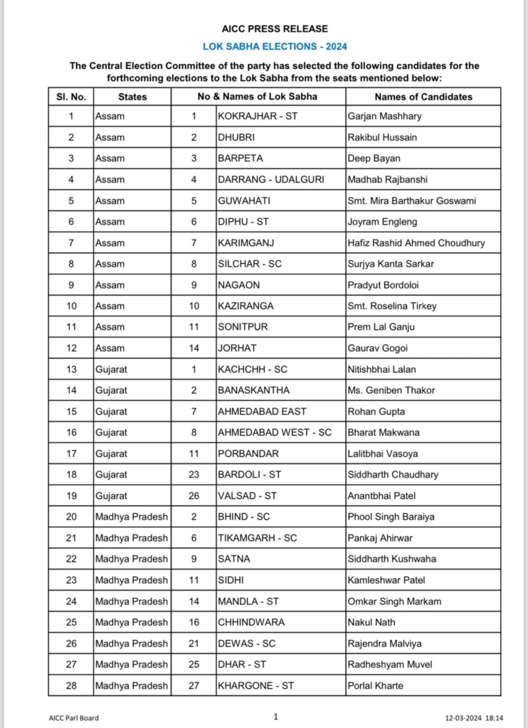 कांग्रेस ने छिंदवाड़ा से कमलनाथ के बेटे नकुलनाथ को टिकट दिया है तो बीजेपी के सोमवार को कांग्रेस में शामिल हुए राहुल कस्वां को चूरू लोकसभा सीट से चुनावी मैदान में उतारा है. इसके अलावा इस लिस्ट में जोरहाट से गौरव गोगोई, सिलचर से सुरज्या खान, जालोर से अशोक गहलोत के बेटे वैभव गहलोत को अपना प्रत्याशी बनाया है.