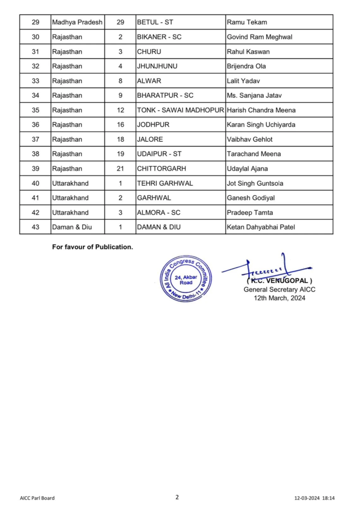 भोपाल: निर्वाचन आयोग कभी भी आगामी आम चुनावों की तारीखों का ऐलान ) कर सकता है. इसके साथ ही राजनीतिक दलों ने लोकसभा चुनाव को लेकर अपनी तैयारियां शुरू कर दी हैं. अब जानकारी आ रही है कि कांग्रेस के वरिष्ठ नेता केसी वेणुगोपाल लोकसभा प्रत्याशियों की दूसरी लिस्ट जारी कर दी है. इस लिस्ट में कांग्रेस ने लोकसभा चुनाव के लिए 43 सीटों पर उम्मीदवारों के नामों का ऐलान कर दिया है. इससे पहले कांग्रेस ने अपनी पहली लिस्ट में 39 उम्मीदवारों के नाम का ऐलान किया था.
